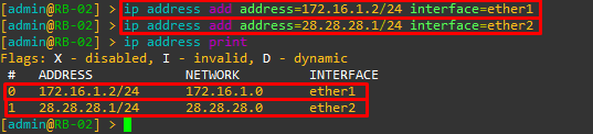 1. Sama halnya dengan RB-01, disini saya akan mengonfigurasikan terlebih dahulu ip address pada setiap port yang digunakan oleh RB-02. Disini saya mengonfigurasikan ip address untuk ether yang terhubung ke RB-02, dengan perintah : ip address add address=172.16.1.1/24 interface=ether1 dan kemudian, saya konfigurasikan ip address untukPC-02 dengan perintah : ip address add address=27.27.27.1/27 interface=ether2. Lalu, periksa apakah ip address sudah terkonfigurasi atau belum dan dapat dilihat bahwa ip address sudah terkonfigurasi.